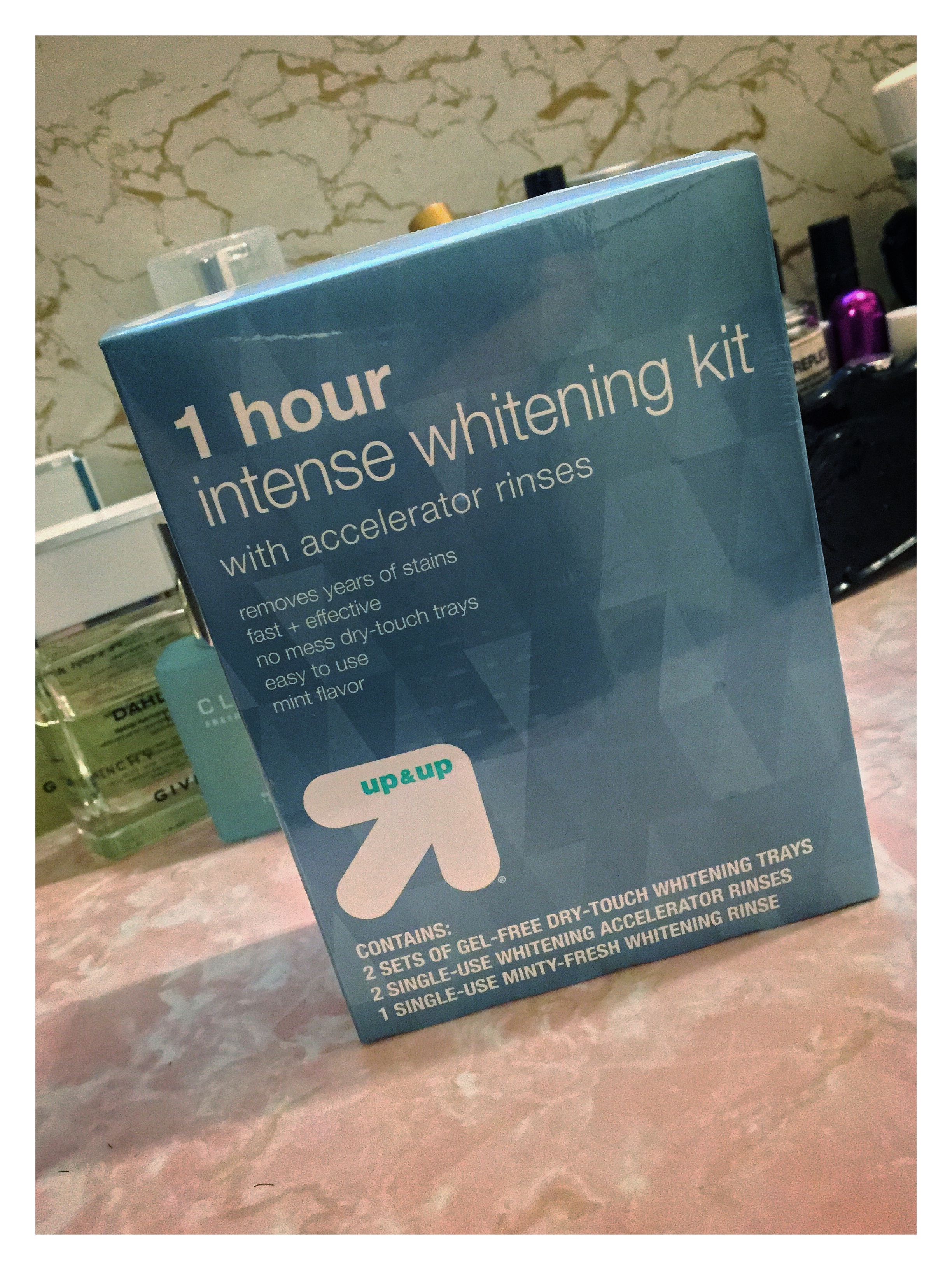 To kickstart my quest for a more sparkly grin, I used the Target 1 hour Intense Whitening Kit with Accelerator Rinses.