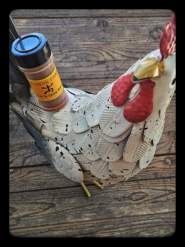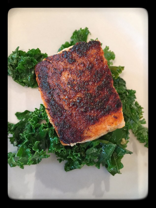 Third condiments? A spice blend. Dry Rub – Blend #1. The ingredients are Paprika, Sugar, Garlic, Salt, Allspice, Cumin, Cinnamon, Ginger Root, Thyme, Mustard Seeds and a touch of brown sugar. It was the brown sugar that inspired me to pack this on a piece of salmon. (One of my favorite salmon dishes is has brown sugar and garlic in it.) Heat up a pan, add a little oil and sear away. When the fish was almost done I flipped it. Cooked until done. We were rewarded with a unique flavored Spice Encrusted Salmon. Added bonus? The kale in the garden was ready. I can’t wait to make this again. And I want to try it on chicken.