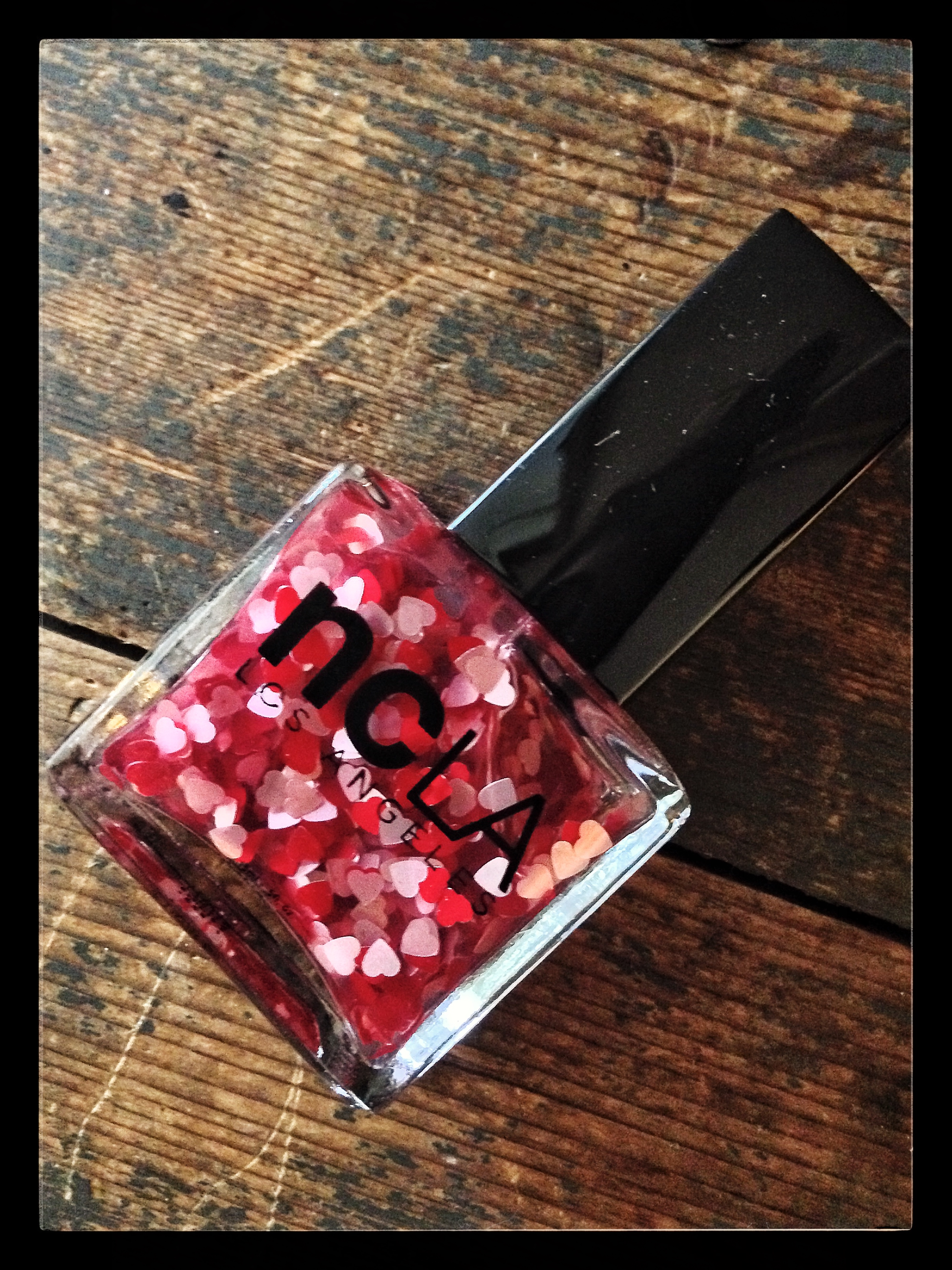 NCLA Polish in Heart Attack. Srsly. How cute is this?! This is a clear base with pink and red mylar hearts. I’ll be wearing this all year long. I might have to try their other polishes, the color selection is amazing! Retails for $16