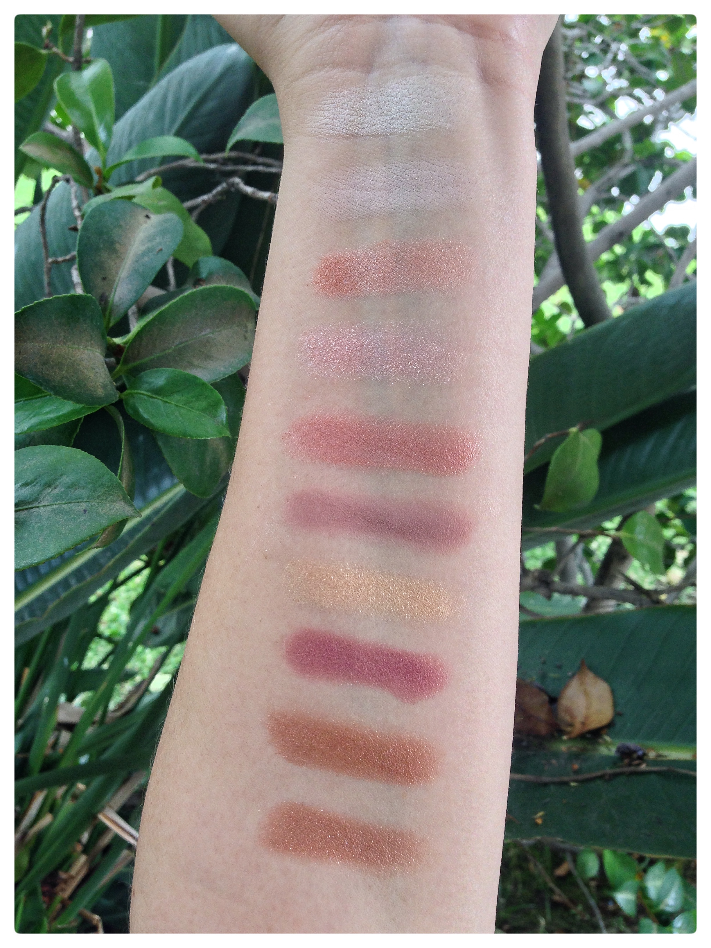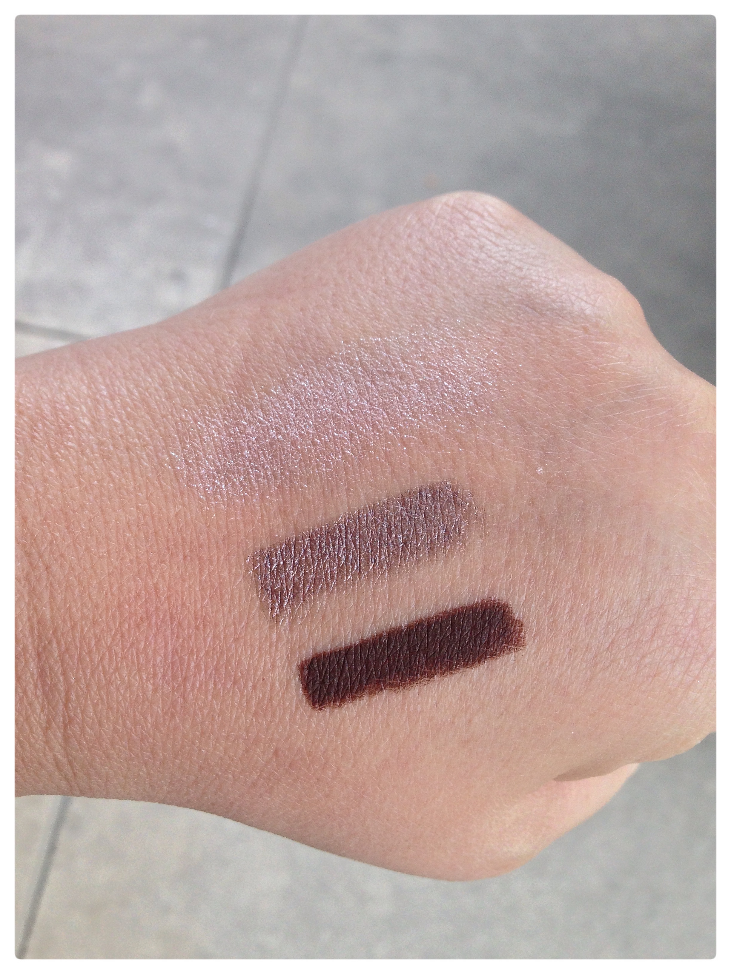 Here are swatches of the Pink Sapphire Powder and The Duo Eyeliner. The eyeliner is showing a little more warm than it really is.